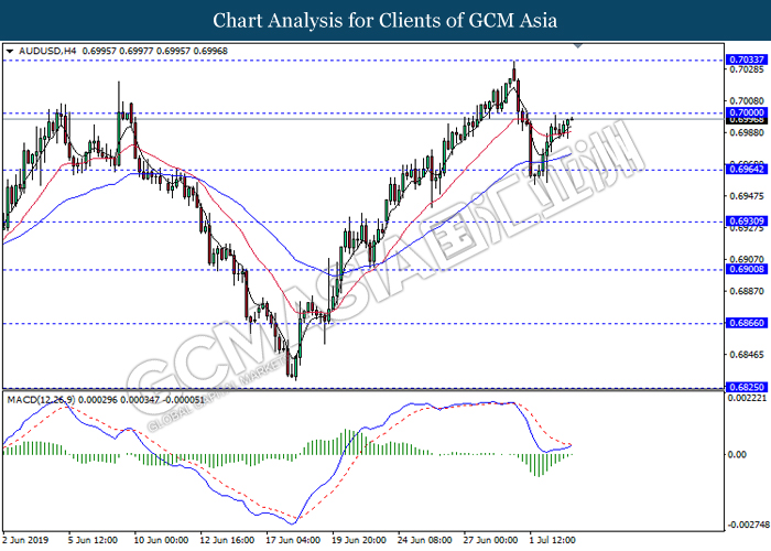 AUDUSD, H4: AUDUSD was traded higher while currently testing near the resistance level 0.7000. MACD which illustrate bullish bias signal with the starting formation of golden cross suggest the pair to extend its gains after it breaks above the resistance level.