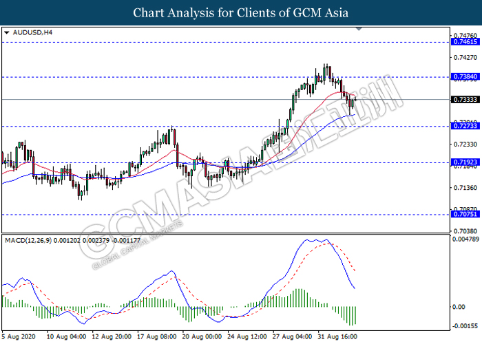AUDUSD, H4: AUDUSD was traded lower following prior retracement from the resistance level 0.7385. However, MACD which display diminishing bearish momentum signal suggest the pair to be traded higher as a short term technical correction towards back the resistance level 0.7385.
