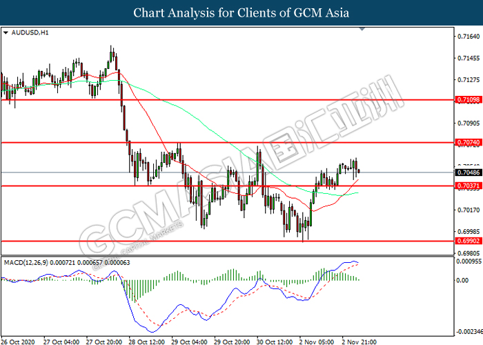 AUDUSD, H1: AUDUSD was traded higher following prior breakout above the previous resistance level at 0.7040. However, MACD which illustrated diminishing bullish momentum suggest the pair to be traded lower in short-term as technical correction.