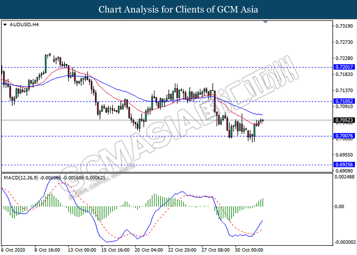 AUDUSD, H4: AUDUSD was traded higher following prior rebound from the support level 0.7005. MACD which illustrate bullish momentum signal with the formation of golden cross suggest the pair to extend its rebound towards the resistance level 0.7105.