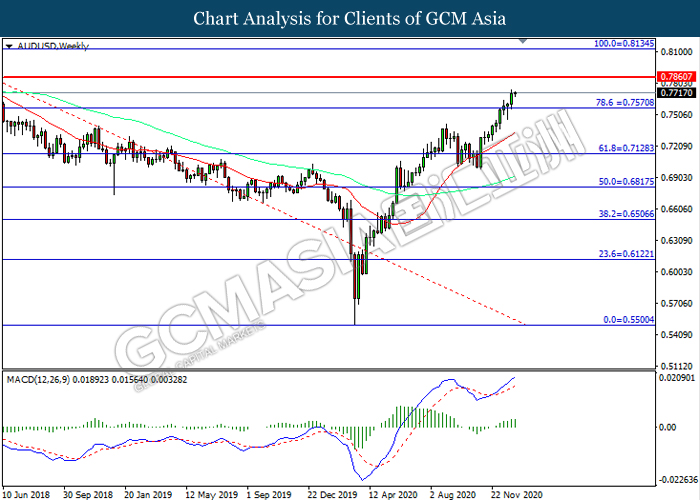 AUDUSD, Weekly: AUDUSD was traded higher following prior breakout above the previous resistance level at 0.7570. MACD which illustrated increasing bullish momentum suggest the pair to extend its gains toward resistance level at 0.7860.