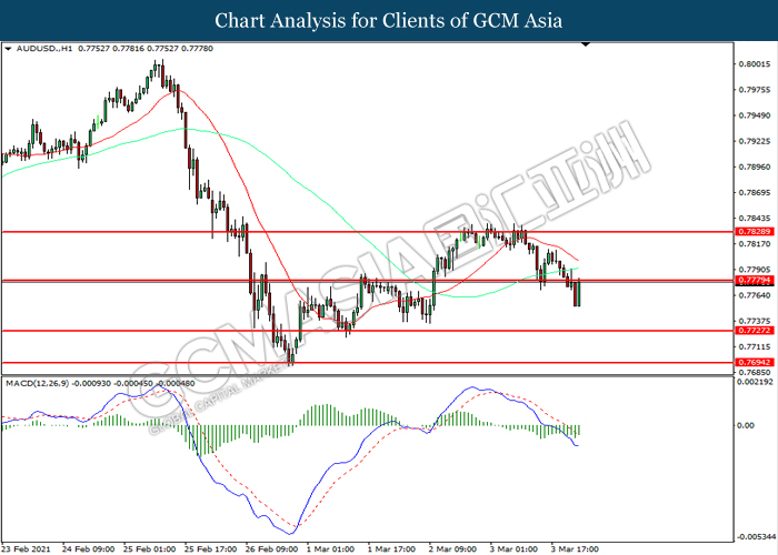 AUDUSD, H1: AUDUSD was traded higher while currently testing the resistance level at 0.7780. MACD which illustrated diminishing bearish momentum suggest the pair to extend its gains after it successfully breakout above the resistance level.