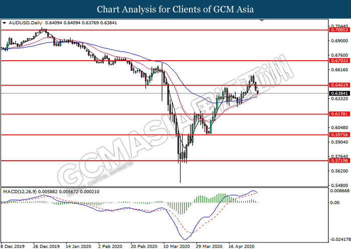 AUDUSD, Daily: AUDUSD was traded lower following prior breakout below the previous support level at 0.6460. MACD which illustrate diminishing bullish momentum suggest the pair to extend its losses toward the support level at 0.6180.