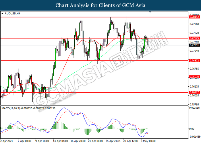 AUDUSD, H4: AUDUSD was traded lower following prior retracement from the resistance level at 0.7755. MACD which illustrated diminishing bullish momentum suggest the pair to extend its losses toward support level at 0.7695.