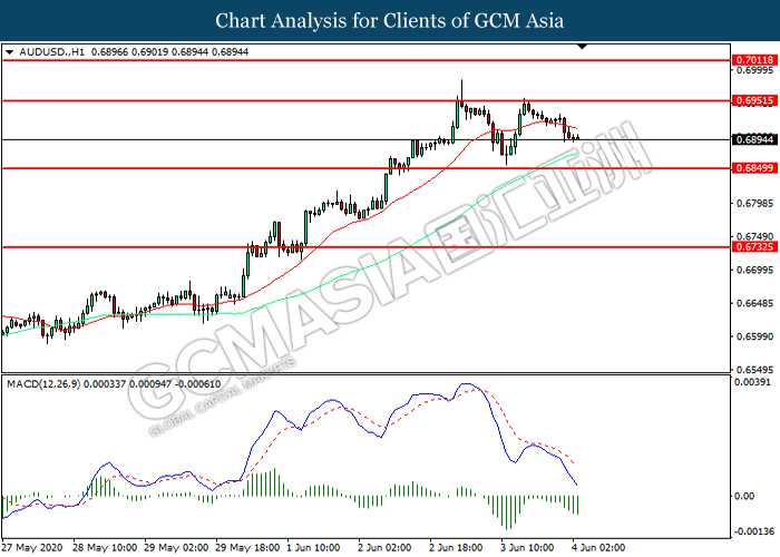AUDUSD, H1: AUDUSD was traded lower following prior retracement from the resistance level at 0.6950. MACD which illustrated increasing bearish momentum suggest the pair to extend its losses toward support level at 0.6850.