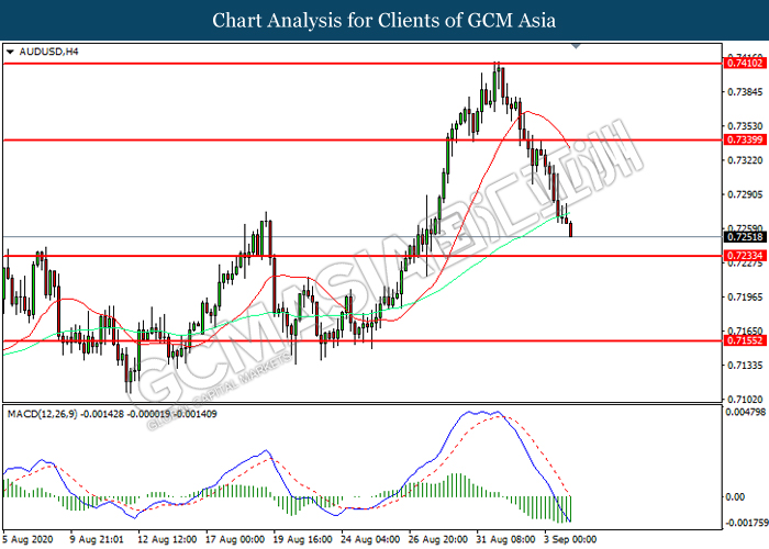 AUDUSD, H4: AUDUSD was traded lower while currently near the support level at 0.7235. MACD which illustrated increasing bearish momentum suggest the pair to extend its losses after it successfully breakout below the support level.