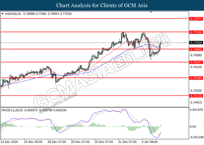 AUDUSD, H1: AUDUSD was traded higher following prior breakout above the previous resistance level at 0.7680. MACD which illustrated bullish bias momentum suggest the pair to be traded higher toward the resistance level at 0.7740.