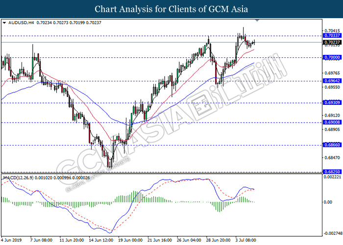 AUDUSD, H4: AUDUSD was traded lower following prior retracement from the resistance level 0.7035. MACD which illustrate bearish bias signal with the starting formation of death cross suggest the pair to extend its retracement towards the support level 0.7000.
