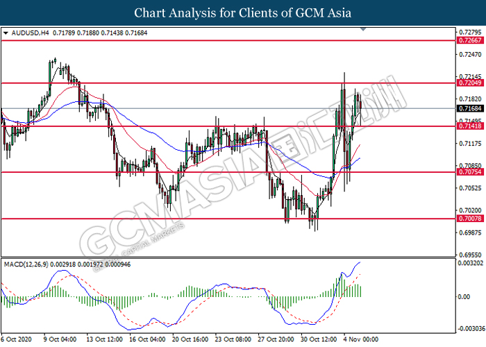 AUDUSD, H4: AUDUSD was traded lower following prior retracement from the higher level. MACD which illustrate diminishing bullish signal suggest the pair to extend its losses toward the support level at 0.7140.