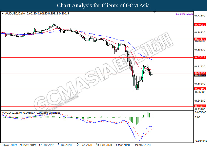 AUDUSD, Daily: AUDUSD was traded lower following prior breakout below the previous support level at 0.6035. MACD which illustrate diminishing bullish momentum suggest the pair to extend its losses toward the support level at 0.5720.