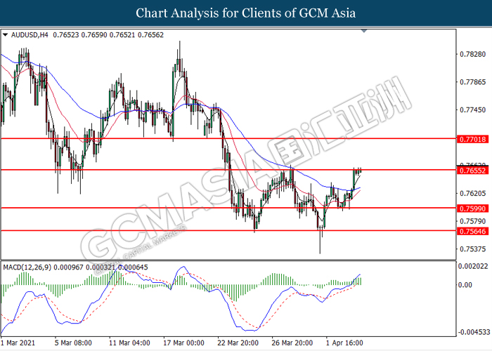 AUDUSD, H4: AUDUSD was traded higher while currently testing the resistance level at 0.7655. MACD which illustrated bullish bias momentum suggest the pair to extend its gains after it successfully breakout above the resistance level.
