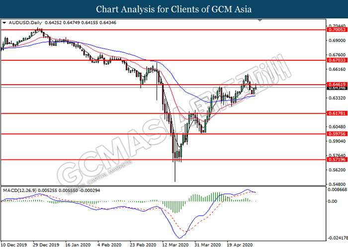AUDUSD, Daily: AUDUSD was traded higher following prior rebound from the 20 moving average line (Red). Due to lack of signal from MACD, it is suggested to wait for further confirmation before entering into market.