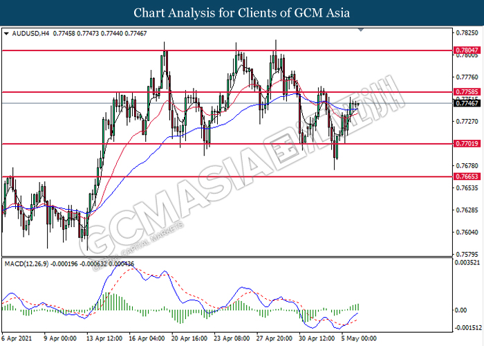 AUDUSD, H4: AUDUSD was traded higher following prior breakout above the previous resistance level at 0.7700. MACD which illustrated bullish bias momentum suggest the pair to extend its gains toward the resistance level at 0.7760.