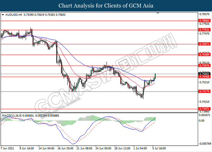AUDUSD, H4: AUDUSD was traded higher following prior breakout above the previous resistance level 0.7545. MACD which illustrate persistent bullish momentum signal suggest the pair to extend its gains towards the resistance level 0.7595.
