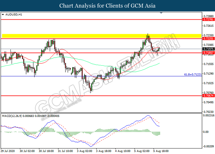 AUDUSD, H1: AUDUSD was higher following prior rebound from the support level at 0.7185. MACD which illustrated diminishing bearish momentum suggest the pair to extend its gains toward resistance level at 0.7225.