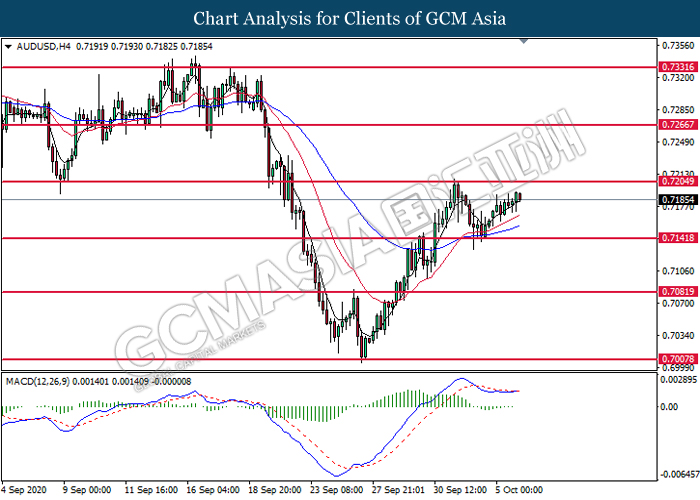 AUDUSD, H4: AUDUSD was traded higher following prior rebound from the support level at 0.7140. MACD which illustrate diminishing bearish momentum signal suggest the pair to extend its gains toward the resistance level at 0.7205.