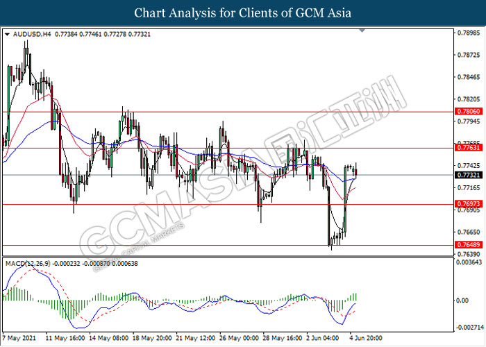 AUDUSD, H4: AUDUSD was traded higher following recent breakout above the previous resistance level 0.7695. However, MACD which illustrate diminishing bullish momentum signal suggest the pair to experience a technical correction back towards the level 0.7695.