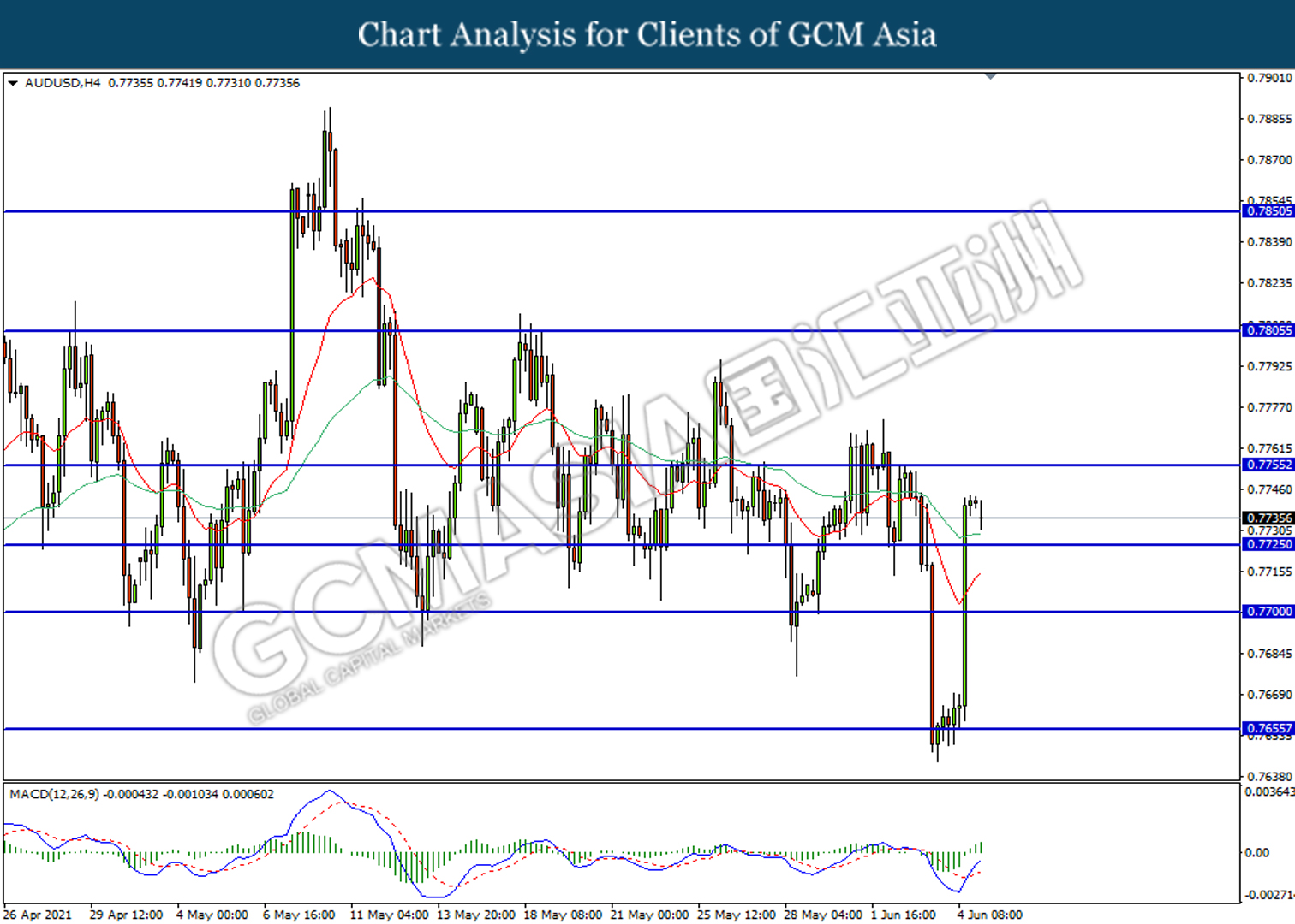 AUDUSD, H4: AUDUSD was traded higher following prior rebound from its previous lower level. MACD which illustrated upward momentum suggest the pair to be traded higher in short-term.