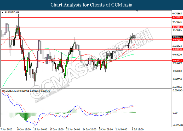 AUDUSD, H4: AUDUSD was traded higher following prior breakout above the previous resistance level at 0.6960. However, MACD which illustrated diminishing bullish momentum suggest the pair to be traded lower in short-term as technical correction.