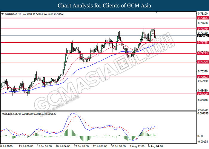 AUDUSD, H4: AUDUSD was traded lower following prior retracement from the resistance level at 0.7235. MACD which illustrate diminishing bullish momentum signal suggest the pair to extend its losses toward the support level at 0.7175.
