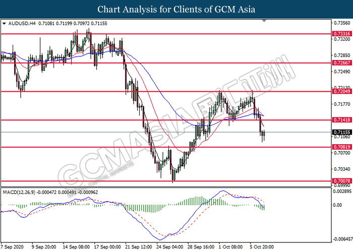 AUDUSD, H4: AUDUSD was traded higher following prior rebound from the lower level. MACD which illustrate diminishing bearish momentum signal suggest the pair to extend its rebound toward the resistance level at 0.7140.
