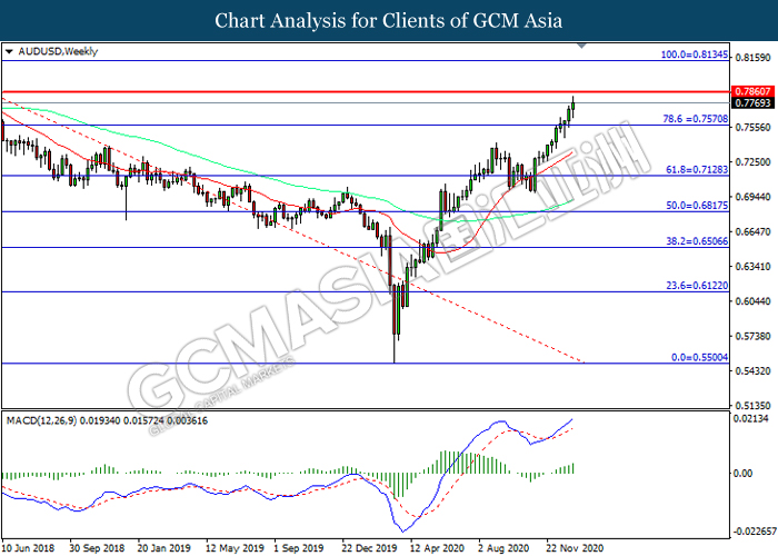 AUDUSD, Weekly: AUDUSD was traded higher while currently testing the resistance level at 0.7860. MACD which illustrated increasing bullish momentum suggest the pair to extend its gains after it successfully breakout above the resistance level.