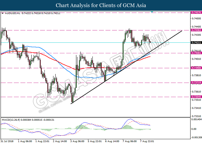 AUDUSD, H1: AUDUSD was traded lower following recent retracement from resistance level 0.7435. MACD which display bearish momentum signal with formation of death cross suggest the pair may experience a short term technical correction towards support level 0.7410 and trend line.
