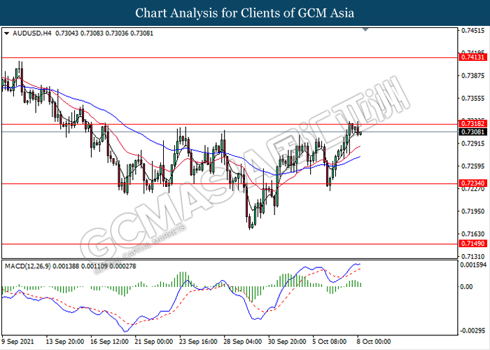 AUDUSD, H4: AUDUSD was traded higher while currently testing near the resistance level 0.7320. However, MACD which illustrate diminishing bullish momentum signal suggest the pair to be traded lower as a technical correction towards the support level 0.7235.