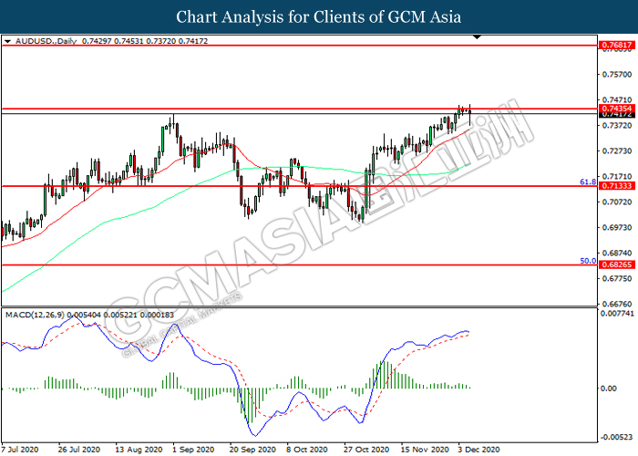 AUDUSD, Daily: AUDUSD was traded higher while currently testing the resistance level at 0.7435. However, MACD which illustrated diminishing bullish momentum suggest the pair to be traded lower in short-term as technical correction.
