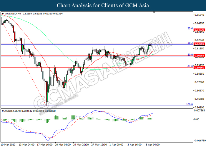 AUDUSD, H4: AUDUSD was traded higher while currently testing the resistance level at 0.6235. However, MACD which illustrated diminishing bullish momentum suggest the pair to be traded lower in short-term as technical correction.