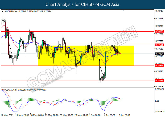 AUDUSD, H4: AUDUSD remain traded in a sideway channel following recent retracement from the resistance level 0.7765. MACD which illustrate bearish bias signal with the formation of death cross suggest the pair to be traded lower towards the support level 0.7695.