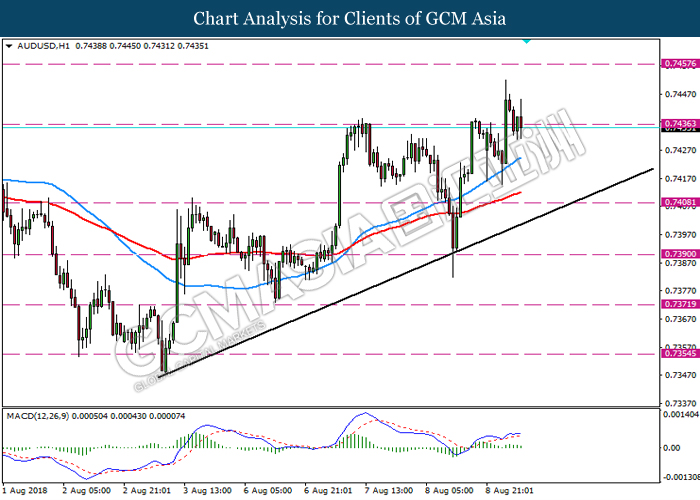 AUDUSD, H1: AUDUSD was traded higher while currently retest the resistance level 0.7435. MACD which illustrate ongoing bullish momentum suggest the pair may extend its gains after it breaks above the resistance level 0.7435.