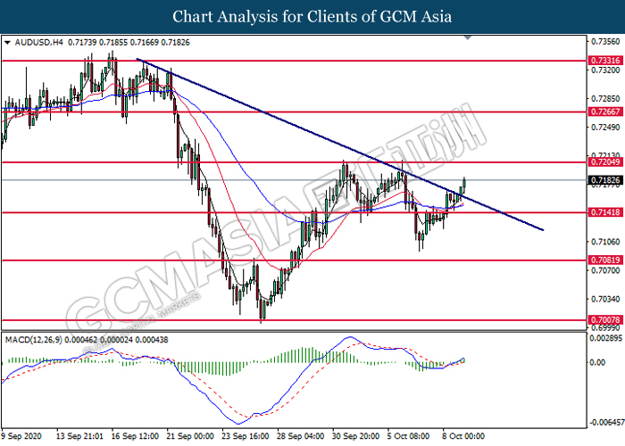 AUDUSD, H4: AUDUSD was traded higher following prior breakout above the downtrend line. MACD which illustrate bullish bias momentum signal suggest the pair to extend its gains toward the resistance level at 0.7205.
