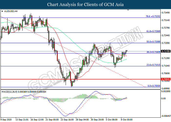 AUDUSD, H4: AUDUSD was traded higher following prior breakout above the resistance level at 0.7160. MACD which illustrated increasing bullish momentum suggest the pair to extend its gains toward resistance level at 0.7210.