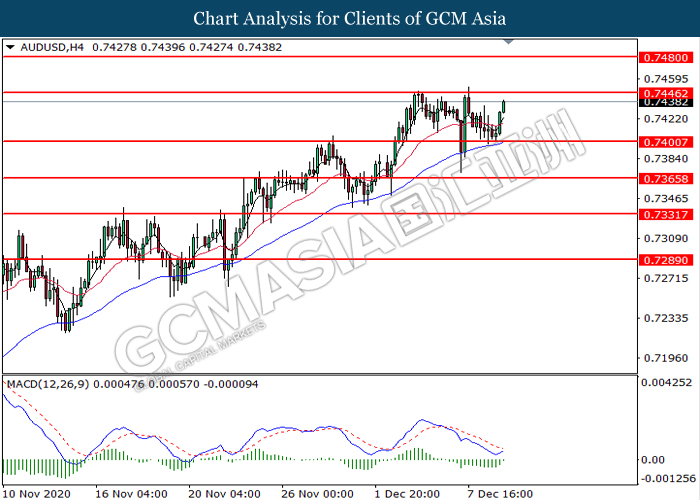 AUDUSD, H4: AUDUSD was traded higher following prior rebound from the support level at 0.7400. MACD which illustrate diminishing bearish momentum signal suggest the pair to extend its gains toward the resistance level at 0.7445.