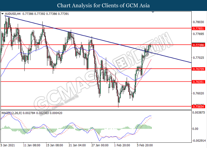 AUDUSD, H4: AUDUSD was traded higher while currently testing the resistance level at 0.7740. However, MACD which illustrated diminishing bullish momentum suggest the pair to undergo technical correction in short term.