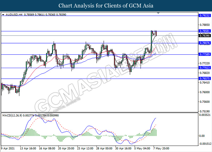 AUDUSD, H4: AUDUSD was traded higher while currently testing near the resistance level 0.7860, However, MACD which illustrate diminishing bullish momentum signal suggest the pair to be traded lower as a technical correction towards the support level 0.7805.