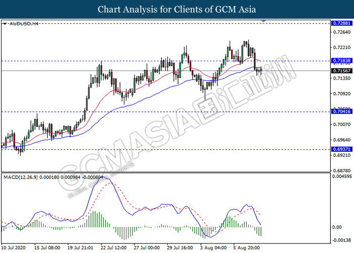 AUDUSD, H4: AUDUSD was traded lower following prior breakout below the previous support level 0.7185. MACD which illustrate bearish momentum signal suggest the pair to extend its losses towards the support level 0.7040.
