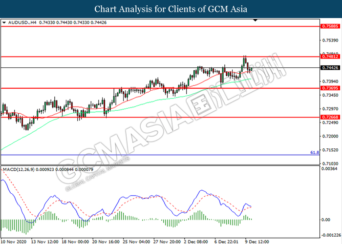 AUDUSD, H4: AUDUSD was traded lower following prior retracement from the resistance level at 0.7480. MACD which illustrated diminishing bullish momentum suggest the pair to extend its losses toward support level at 0.7370.