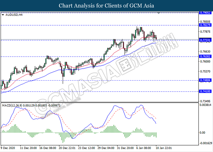 AUDUSD, H4: AUDUSD was traded lower while currently testing the support level 0.7735. MACD which display persistent bearish momentum signal suggest the pair to extend its losses after it breaks below the support level.