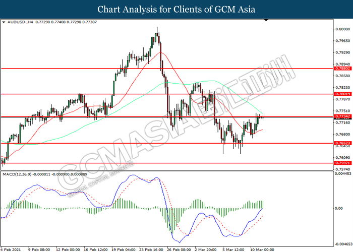 AUDUSD, H4: AUDUSD was traded higher while currently testing the resistance level at 0.7735. However, MACD which illustrated diminishing bullish momentum suggest the pair to be traded lower in short-term as technical correction.