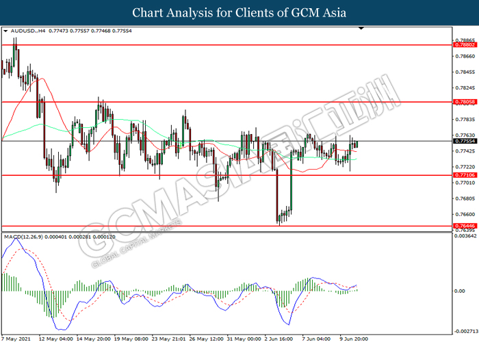 AUDUSD, H4: AUDUSD was traded higher following prior rebound from the support level at 0.7710. MACD which illustrated increasing bullish momentum suggest the pair to extend its gains toward resistance level at 0.7805.
