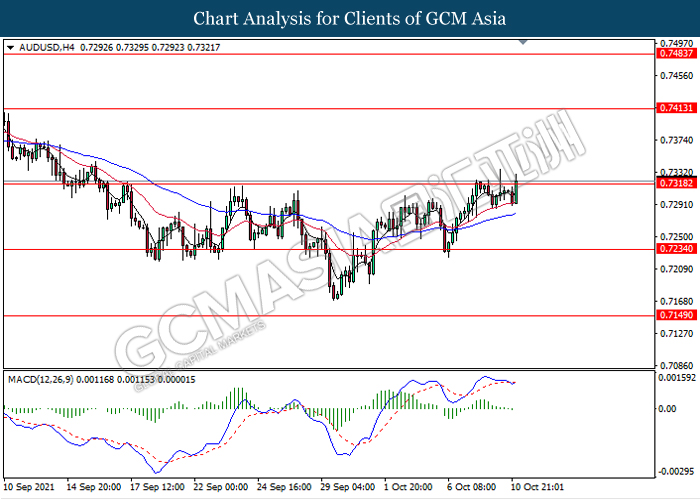 AUDUSD, H4: AUDUSD was traded higher while currently testing the resistance level 0.7320. MACD which illustrate bullish bias signal suggest the pair to extend its gains after it breaks above the resistance level 0.7320.