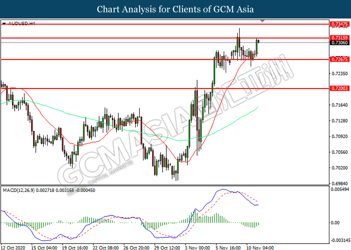 AUDUSD, H4: AUDUSD was traded higher while currently testing the resistance level at 0.7315. MACD which illustrated diminishing bearish momentum suggest the pair to extend its gains after it successfully breakout above the resistance level.