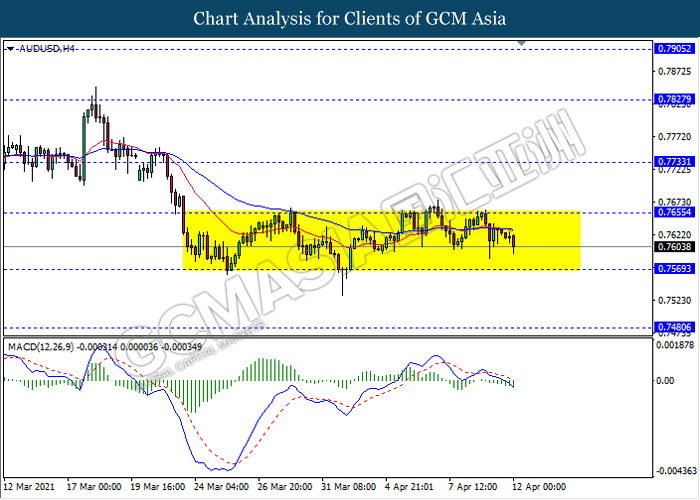 AUDUSD, H4: AUDUSD remain traded in a sideway channel following recent retracement from the resistance level 0.7655. However, MACD which illustrate bearish bias signal suggest the pair to extend its retracement in short term towards the support level 0.7570.