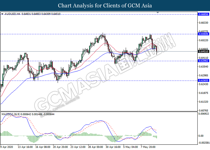 AUDUSD, H4: AUDUSD was traded lower following prior retracement from the resistance level 0.6560. MACD which illustrate bearish bias signal with the formation of death cross suggest the pair to extend its losses towards the support level 0.6390.