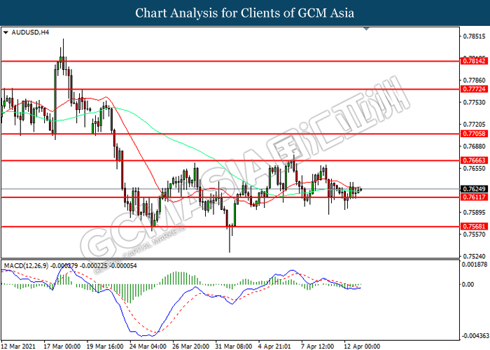 AUDUSD, H4: AUDUSD was traded lower while currently testing the support level at 0.7610. However, MACD which illustrated diminishing bearish momentum suggest the pair toe extend its gains toward resistance level at 0.7665.