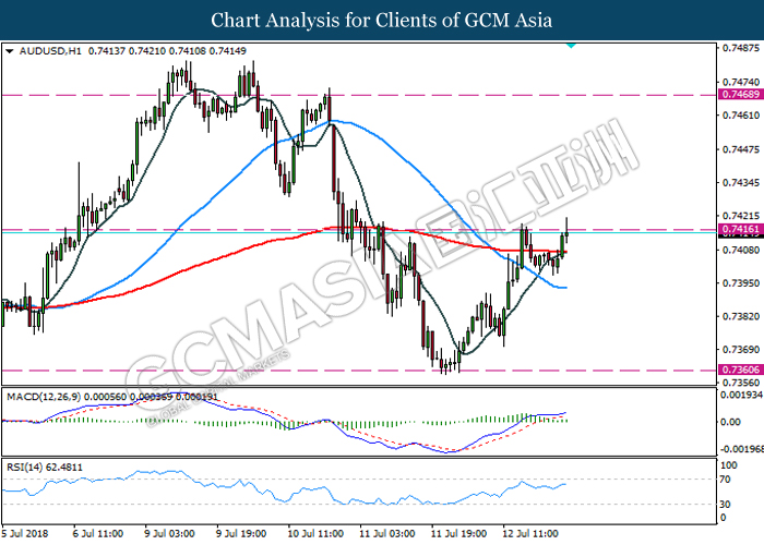 AUDUSD, H1: AUDUSD was traded higher while currently retest the resistance level 0.7420. MACD and RSI which illustrate ongoing upward bias suggest the pair could extend its gains after break above the resistance level 0.7420.