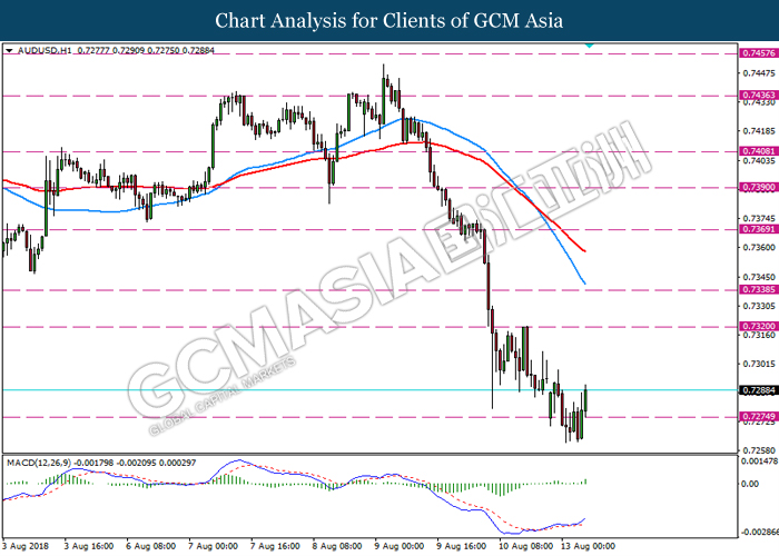 AUDUSD, H1: AUDUSD was traded lower following recent rebound from the support level 0.7275. Recent price action and MACD which illustrate bullish signal suggest the pair to be traded higher as a short term technical correction towards resistance level 0.7320.