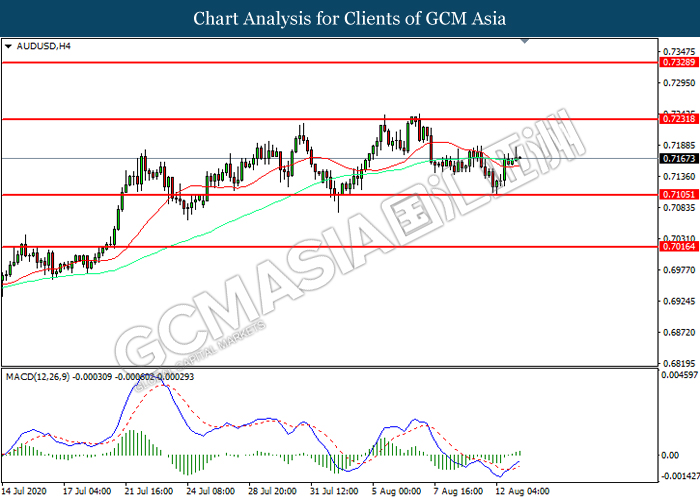 AUDUSD, H4: AUDUSD was traded higher following prior rebound from the support level at 0.7105. MACD which illustrated increasing bullish momentum suggest the pair to extend its gains toward resistance level at 0.7230.